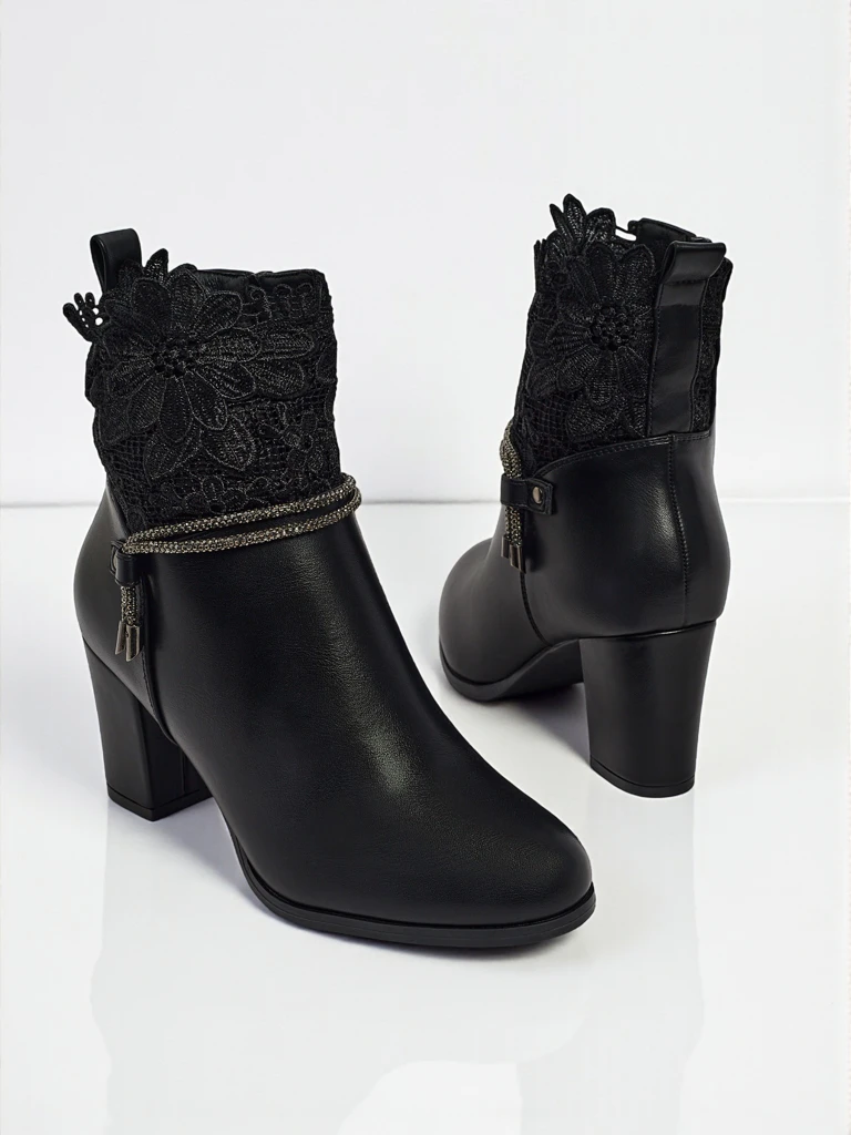 - Udobni gležnarji s peto, izdelani iz ekološkega usnja. Model se zapenja z zadrgo. Model je rahlo podložen s krznom in ima okrasno čipko na strani zgornjega dela. Idealna izbira za jesen!