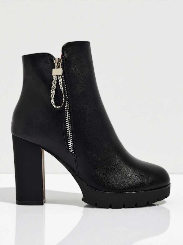 - Udobni gležnarji s peto, izdelani iz eko usnja. Model se zapenja z zadrgo. Model je rahlo podložen s krznom, ima okrasno zadrgo s cirkoni. Idealna izbira za jesen!