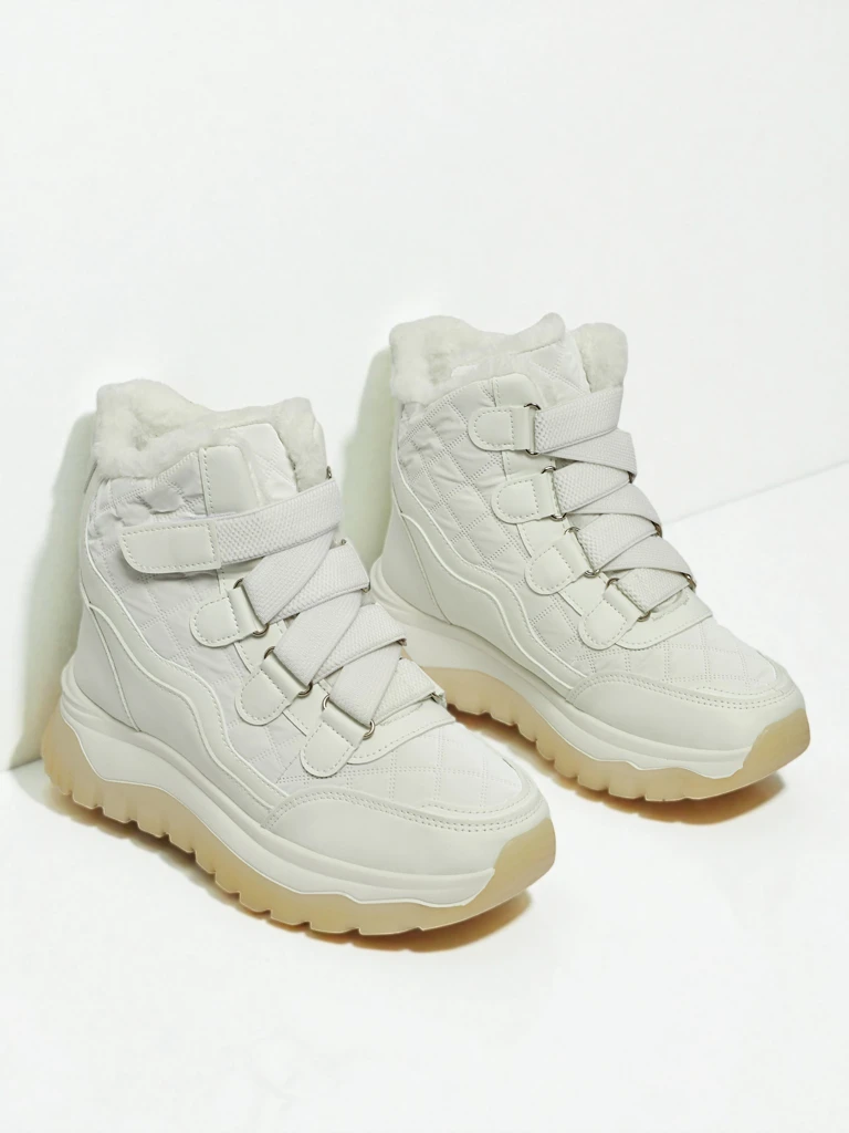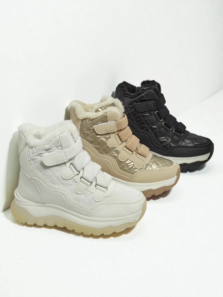 • Odlični ženski zimski škornji za sneg na debelejšem podplatu tipa platforma. Zgornji del je izdelan iz ekološkega usnja in prešite tkanine, notranjost je izolirana s krznom. Model se zapenja z ježki. Idealna osnova za zimo!
