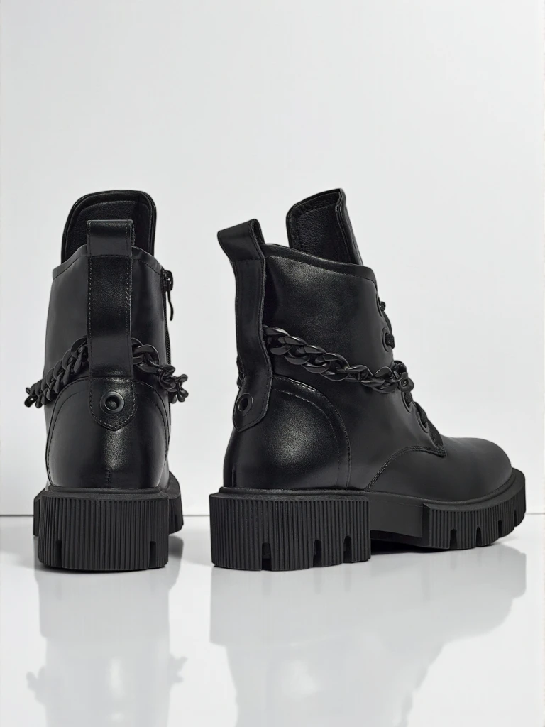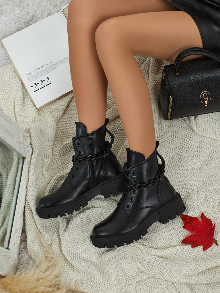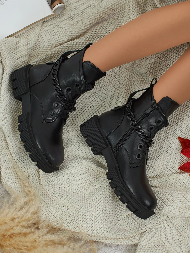 - Ženski gležnarji iz eko usnja, z zadrgo, okrasno verižico in okroglo konico, dodatno ogreti s krznom – modernost, udobje in stil v enem.