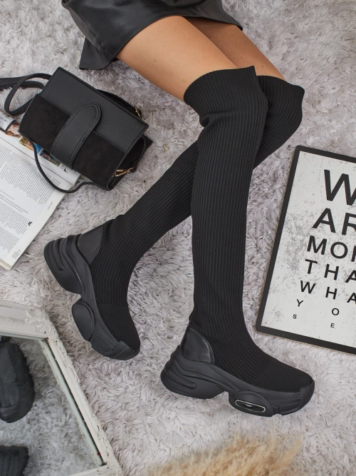 • Stilski ženski škornji čez koleno z masivnim podplatom. Zgornji del je izdelan iz elastičnega tkaninskega materiala z vstavki iz eko usnja, v notranjosti je tekstilni vložek. Model je na natik. Idealni za vsakodnevne jesenske kombinacije!