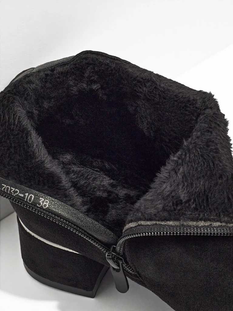 - Čudoviti gležnjarji s peto, izdelani iz eko semiša. Model se zapenja z zadrgo. Model je rahlo podložen s krznom, ima okrasno zadrgo na zadnji strani zgornjega dela.