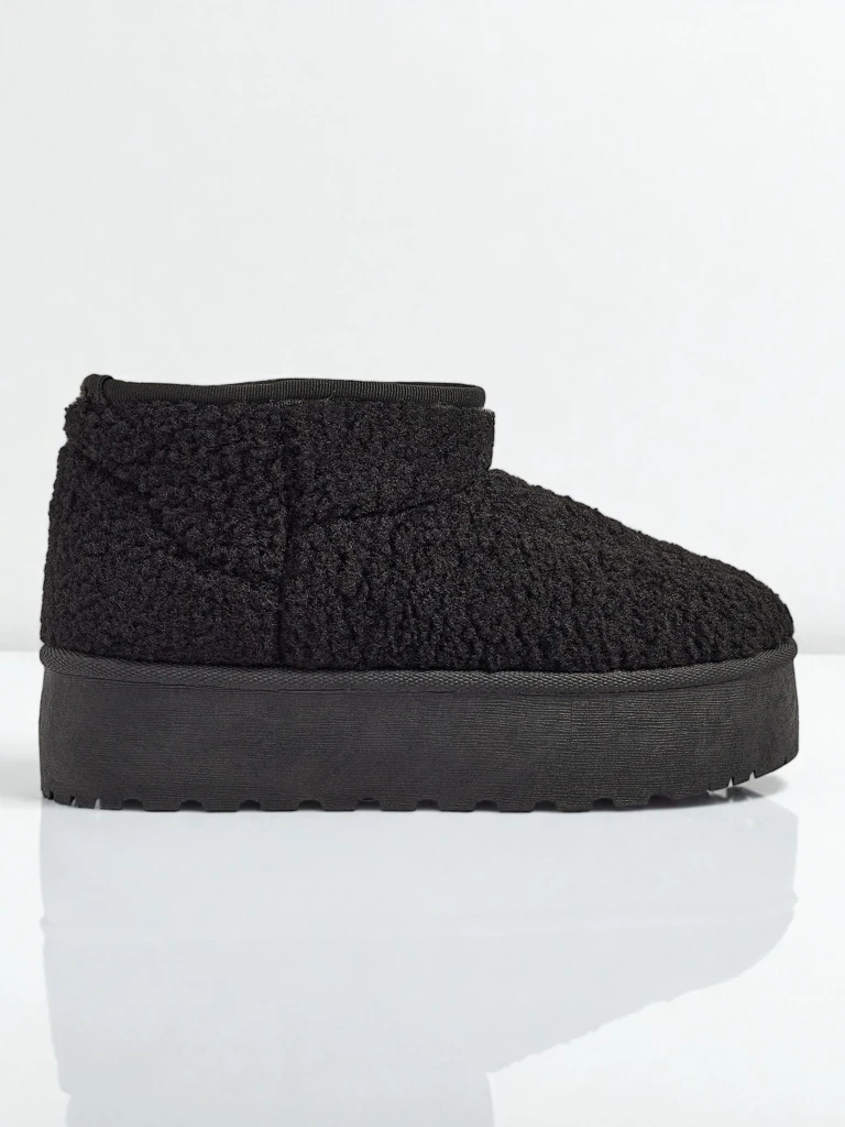 - Odlični ženski zimski škornji za sneg na debelejšem podplatu tipa platforma. Zgornji del je izdelan iz tkanine a'la ovčja koža, notranjost je izolirana s krznom. Idealna osnova za zimo!