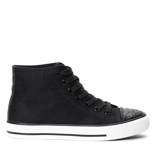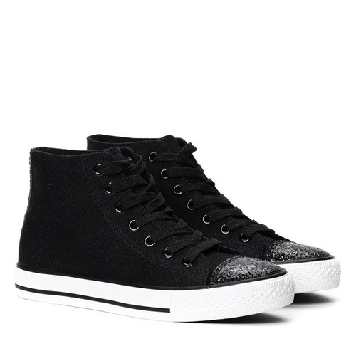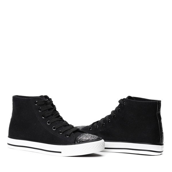 • Klasyczne trampki z wysoką cholewką. Dodatkowo nosek zdobiony brokatowym confetti. Jasna, tkaninowa wkładka. Idealna dla każdej kobiety.