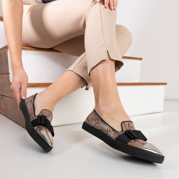 - Nazúvanie s kovovou špicatou špičkou, zdobené mašľou. Obuv vyrobená z ekologickej kože a'la hadej kože. Vďaka svojej klasickej jednoduchosti ladia s mnohými outfitmi. POZNÁMKA: strieborný prvok môže byť poškodený!