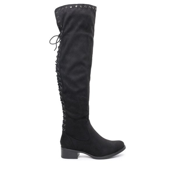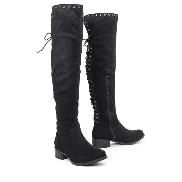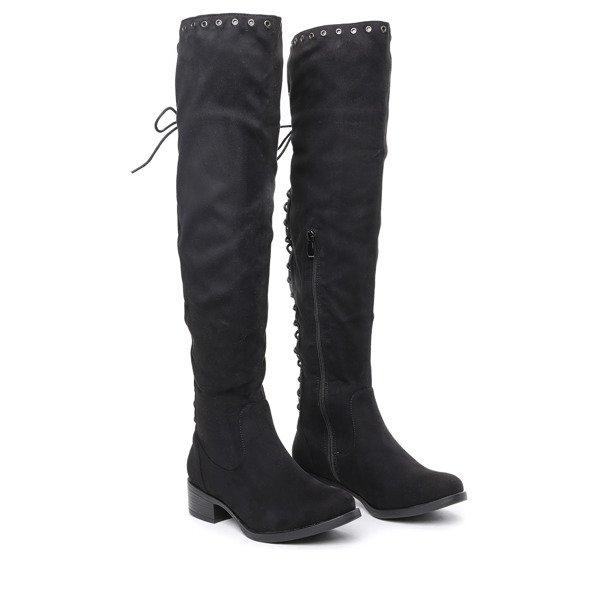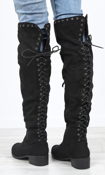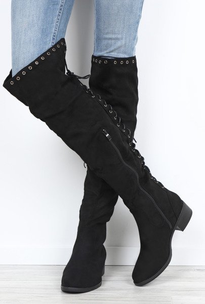 - Wyjątkowe, długie kozaki na płaskim obcasie i wykonane z ekologicznego zamszu. Obuwie zdobione przelotkami i wiązaniami z tyłu i zapinane jest na suwak z boku. W środku delikatne ocieplenie w formie futerka. Pasują zarówno do spodni jak i spódniczek.