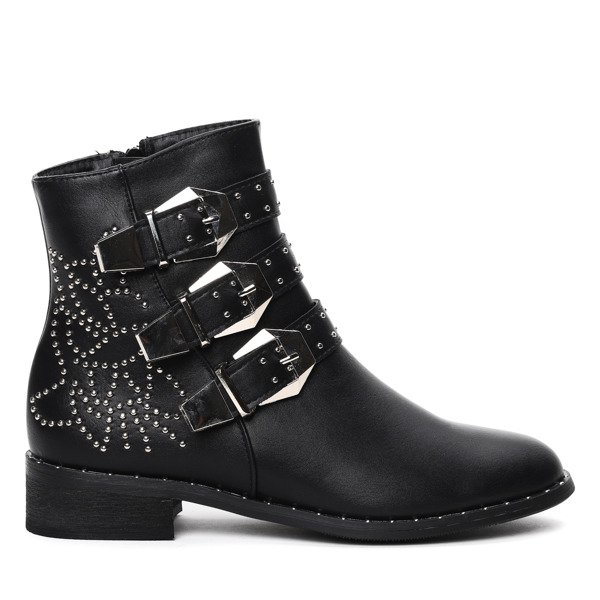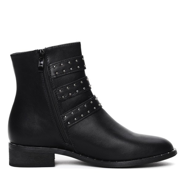 • Niepowtarzalne botki zdobione dżetami. Delikatny, płaski obcas. Obuwie wykonane z ekologicznej skóry. Na cholewce ozdobne trzy paski. W środku delikatne ocieplenia w formie futerka.