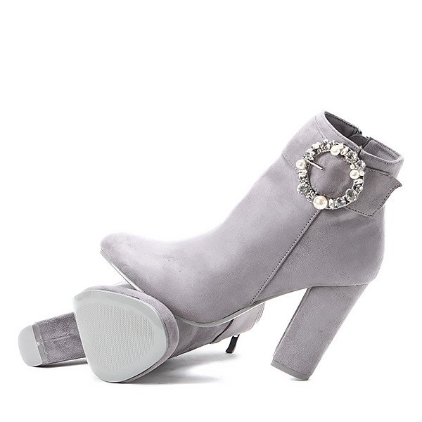 • Eleganckie botki z miękkiego eko zamszu na słupku. No cholewce pasek z sprzączką zdobioną cyrkoniami i sztucznymi perełkami. Model zapinany na zamek. Idealny dodatek to jesiennych stylizacji!