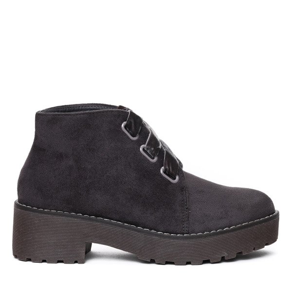 - Botki w najprostszym wydaniu, wykonane z miękkiego zamszu ekologicznego. Sznurówki z weluru. Wkładka pokryta ekologiczną skórą. Obuwie na 5 cm, płaskim obcasie. Solidnie wykonane i bardzo wygodne dzięki grubej podeszwie.