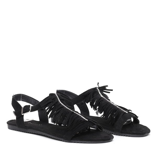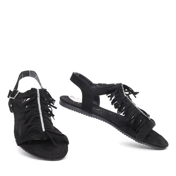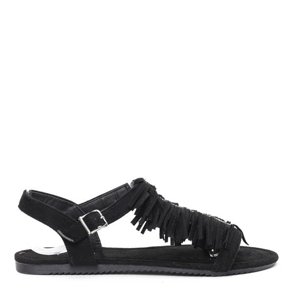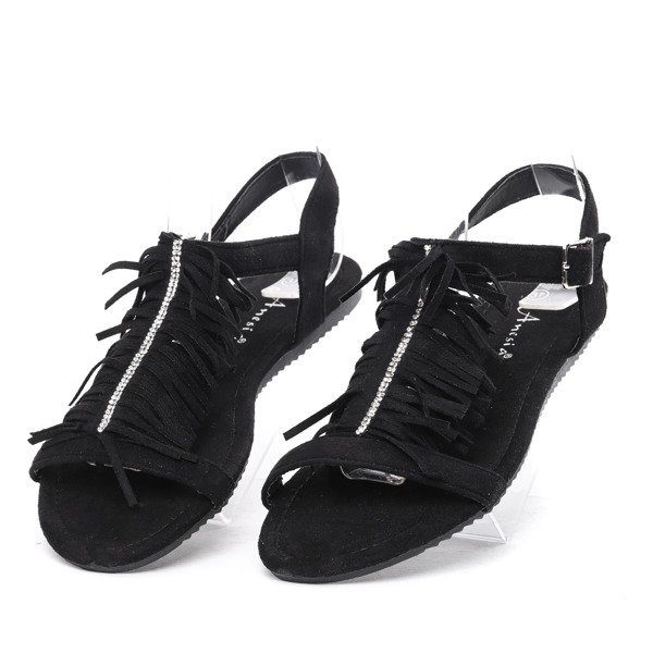 • Sandały w stylu boho wykonane ze skóry ekologicznej zamszowej. Paseczek z frędzelkami oraz ozdobnymi cyrkoniami. Model zapinany sprzączką po boku.