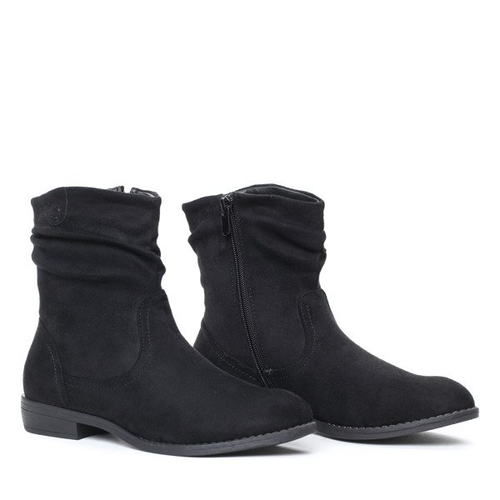 - Klasyczne botki wykonane z zamszu ekologicznego. W środku delikatne ocieplenie w formie futerka. Delikatny, płaski obcas. Model zapinany na suwak z boku.