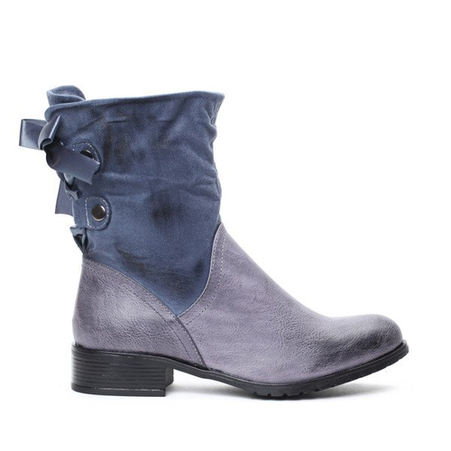 - Botki na płaskim obcasie wykonane z ekologicznego zamszu oraz ekologicznej skóry. W środku delikatne ocieplenie w formie futerka. Model zapinany na suwak po boku. Tylna część wiązana wstążką. UWAGA: produkt może posiadać zabrudzenia na cholewce!