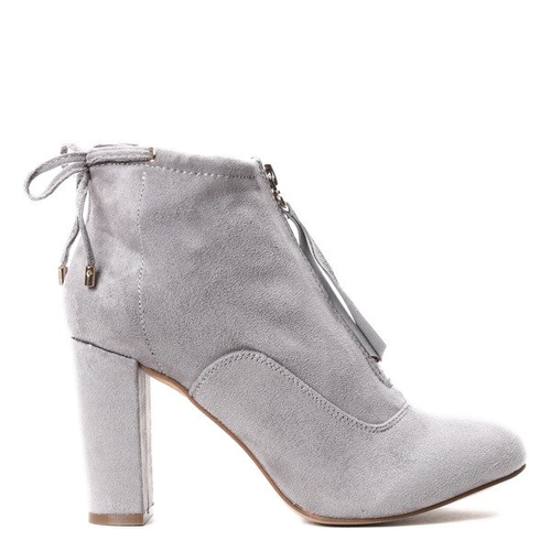 • Eleganckie botki na słupku wykonane z ekologicznego zamszu. Model zapinany suwakiem, który znajduje się na podbiciu buta. Z tyłu ozdobna kokardka. Świetnie sprawdzą się jako dodatek do spódniczek!