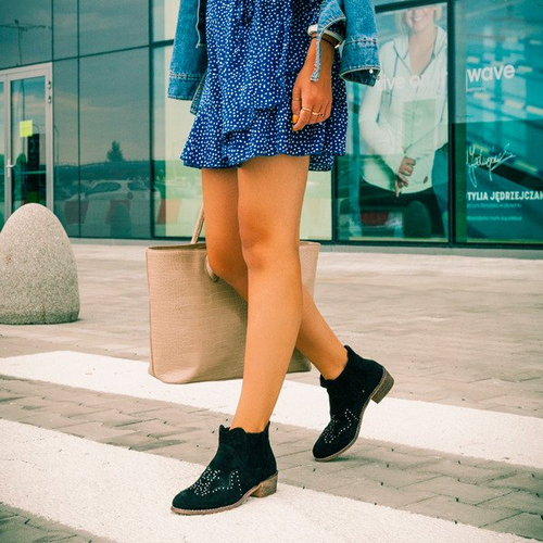 - Rewelacyjne botki na płaskim, drewnianym obcasie wykonane z zamszu ekologicznego. W środku delikatne ocieplenie w formie futerka. Cholewka zdobiona srebrnymi dżetami. Idealny dodatek do jesiennych stylizacji!