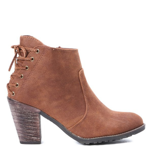 - Eleganckie botki na słupku wykonane z matowego, ekologicznego zamszu. Model zapinany na suwak z boku. Cholewka z tyłu zdobiona jest wiązaniem. Brak ocieplenia. Pasują zarówno do spódnic jak i spodni!