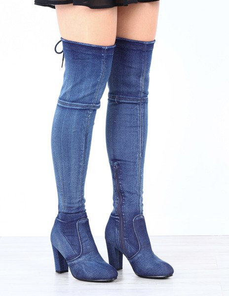 - Długie kozaki na słupku wykonane z materiału imitującego jeans. Obuwie zapinane na suwak po boku. Bardzo modny model, będzie pasował do wielu stylizacji.