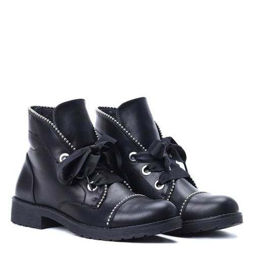 - Dziewczęce botki wykonane ze skóry ekologicznej. Model wiązany na wstążkę. Krawędzie cholewki zdobione srebrnymi koralikami. Obuwie posiada delikatne ocieplenie w środku w formie futerka.