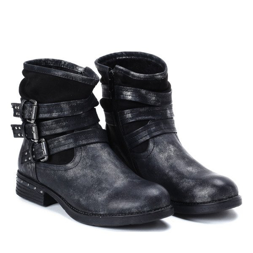 - Rewelacyjne botki na płaskim obcasie w rockowym stylu. Cholewka wykonana z miękkiego eko zamszu oraz przecieranej eko skóry. W środku delikatne ocieplenie w formie futerka. Model zdobiony trzema klamrami i dżetami. Zapinane na suwak z boku.