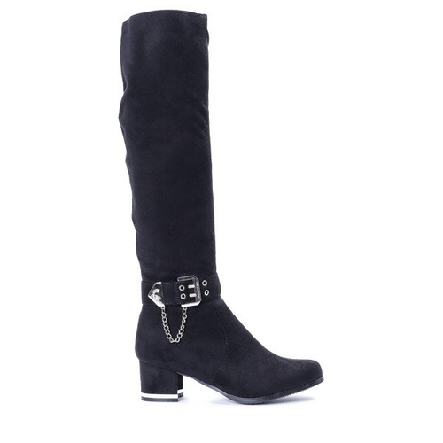 • Wyjątkowe, długie kozaki na niskim słupku wykonane z ekologicznego zamszu. W środku ocieplenie w formie futerka. Cholewka zdobiona klamrą i cyrkoniami. Wokół obcasa srebrna lamówka. Model zapinany na suwak. Idealnie sprawdzą się ze spodniami!