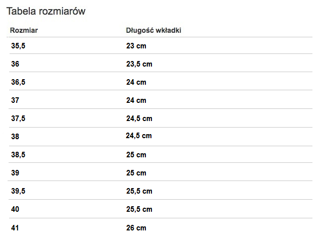 UWAGA!!! Model ma inną rozmiarówkę-zalecamy wybrać dla wąskich stóp rozmiary bez połówek, a dla stóp szerszych rozmiary z połówkami.