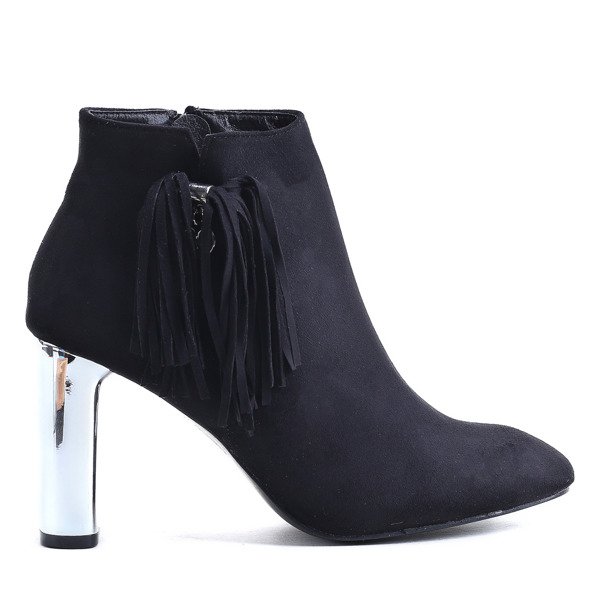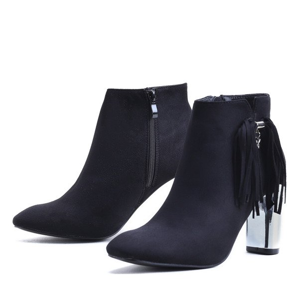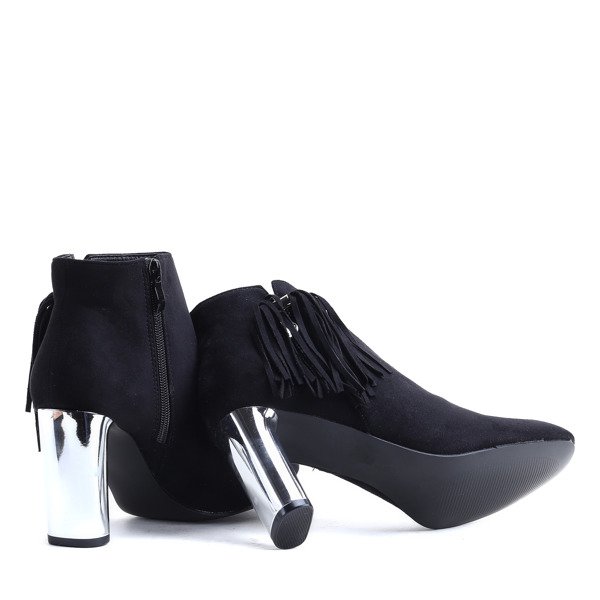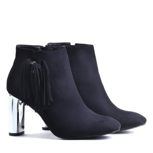 - Rewelacyjne botki na metalicznym słupku wykonane z ekologicznego zamszu. Cholewka zdobiona frędzelkami i zawieszką. Płaski, kwadratowy nosek. W środku delikatne ocieplenie w formie futerka. Model zapinany na suwak.