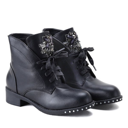 - Ocieplane futerkiem workery wykonane ze skóry ekologicznej. Cholewka wiązana sznurówkami. Na języku ozdoba z kamyczków. Buty świetnie sprawdzą się do każdej codziennej stylizacji.