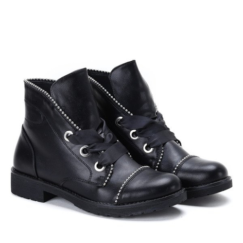 • Stylowe workery na płaskim obcasie ze skóry ekologicznej. Idealnie nadają się na chłodniejszy sezon. Buty posiadają ozdobne, srebrne dżety, oraz solidną i grubą podeszwę. Model wiązany wstążką. Idealna propozycja dla pań w dobrym stylu.