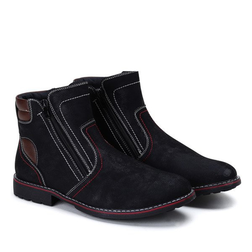 - Klasyczne męskie botki wykonane ze skóry ekologicznej zamszowej typu nubuk. Model zapinany dwoma suwakami, które znajdują się po boku. W środku ocieplenie w formie kożuszka.