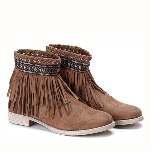 - Niesamowite botki na słupku wykonane ze skóry ekologicznej zamszowej. Cholewka zdobiona frędzlami i azteckimi wzorami. Model zapinany na zamek z tyłu. Idealny dodatek do jesiennych kreacji!