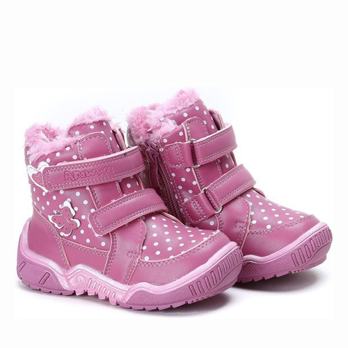 • Dziewczęce sportowe obuwie zdobione w białe groszki. Model zapinany na rzepy i suwak. W środku ocieplenie w formie futerka. Solidnie wykonane i bardzo wygodne, dzięki grubej podeszwie.