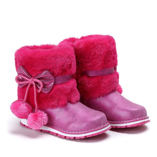 - Niesamowicie wygodne botki wykonane ze skóry ekologicznej z błyszczącym wykończeniem. W środku posiadają ocieplenie w formie futerka. Model zapinany na rzepy i suwak. Cholewka zdobiona z boku kokardką i pomponami.