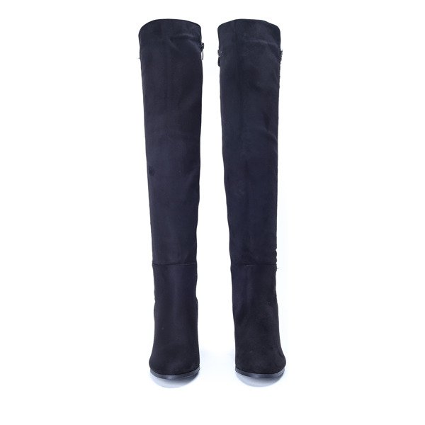 • Długie kozaki na słupku wykonane częściowo ze skóry ekologicznej zamszowej oraz z rozciągliwej tkaniny. Model ocieplany futerkiem, który znajduje się w przedniej części buta. Zdobione małymi cyrkoniami oraz zapinane suwakiem po boku.
