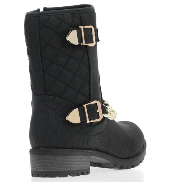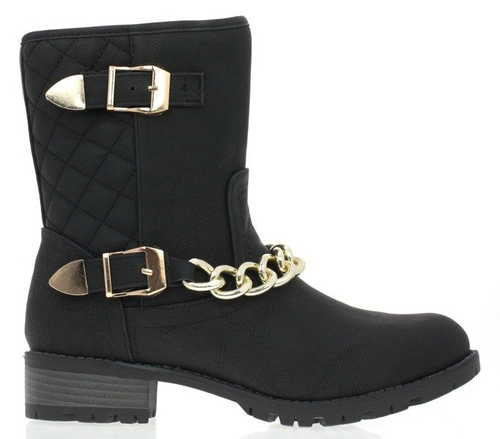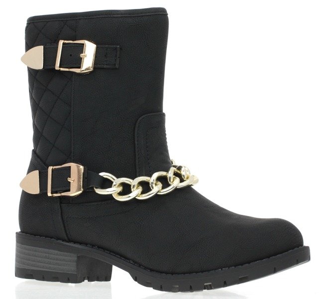 - Botki z ozdobnym łańcuszkiem na niskim obcasie. Cholewka ozdobiona pikówką i klamrami. Solidnie wykonane i bardzo wygodne. Nadają się do wielu odważnych stylizacji.