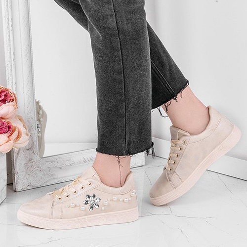 Beżowe tenisówki z perełkami i cyrkoniami Flora - Obuwie